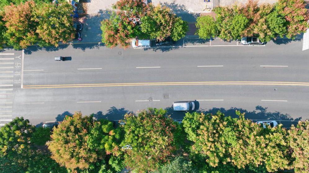 金秋九月,走在湖南邵阳市双清区邵石南路街头,一路上都被红黄相间的复羽叶栾树点缀,在成片的绿荫之中尤为亮眼。